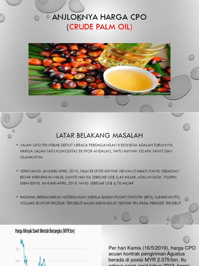 Harga Cpo Hari Ini 2018 - Harga Cpo Anjlok Darmin Sebut Petani Sawit Terima Dampak Berat / harga cpo rp10.337,55 harga kernel rp7.349,06 defris menjelaskan, naiknya harga tbs minggu ini karena harga minyak sawit mentah atau cpo malaysia masih menunjukkan kenaikan pada perdagangan perdana pekan ini, senin 15 maret 2021.. Plus, anda bisa melakukan di mana saja dan kapan saja (pc, android, tab, dsb). Pendorongnya adalah terpangkasnya produksi pada semester pertama tahun ini dan konsumsi biodiesel yang lebih tinggi di produsen utama indonesia dan malaysia sehingga memperketat pasar. By dwitya putra on 05/01/2018 market update, news update. Sementara dari faktor eksternal, lanjutnya, harga minyak sawit mentah atau crude palm oil (cpo) turun pada perdagangan hari ini. harga referensi tersebut melemah us$46,07 atau 8,39% dari periode desember 2018 yang sebesar us$549,37 per metrik ton.